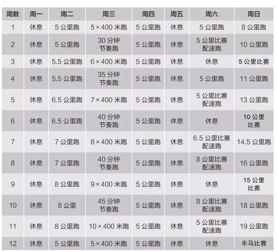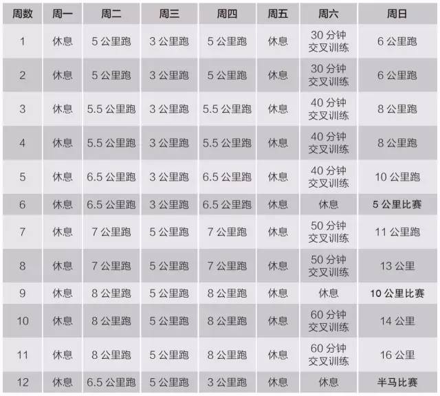 周一和周五休息,周二和周四轻松跑,周三次长距离跑,周六长距离跑,周日进行30~60分钟的交叉训练。在第8周进行一次半马测试比赛后,你就更有把握在全马比赛中获得成功了。