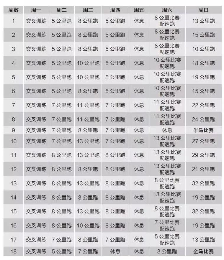 这是最流行的训练计划,其关键部分在于周六的长距离跑。从第一周是10公里跑,逐渐发展到第15周的32公里,随后开始为准备全马比赛而减量。