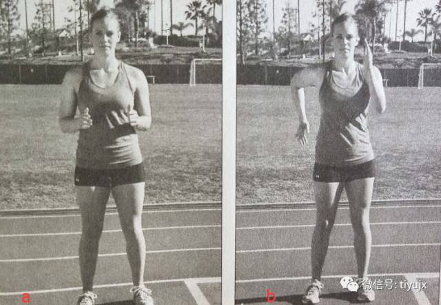 摆动双臂,手在身体的前面向上摆到大约与肩同高,并在身体后面经过臀部(见图b)。双手放松。
