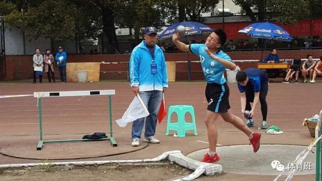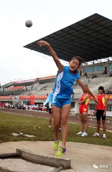 3、在投掷区5~8米的地方,设置一个平行于投掷圈延长线,高2.5米左右的橡皮筋,练习者用完整的技术将球推过橡皮筋,要求推球时展体增加出手角度。