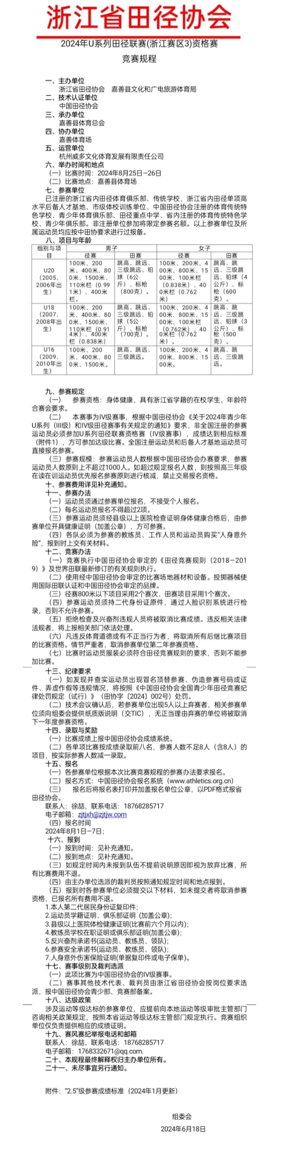 2024年U系列田径联赛(浙江赛区3)资格赛嘉善站