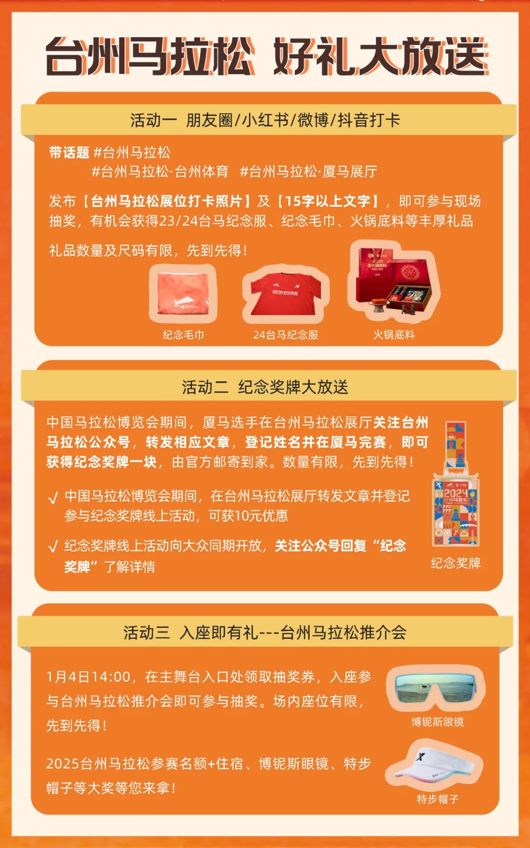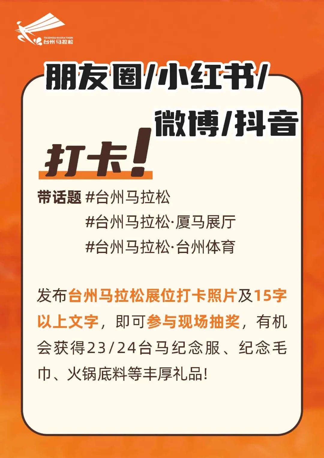 拍摄台州马拉松展位照片,上传至社交媒体并添加话题 #台州马拉松# 等标签,即有机会赢取火锅底料、纪念服等丰厚奖品!