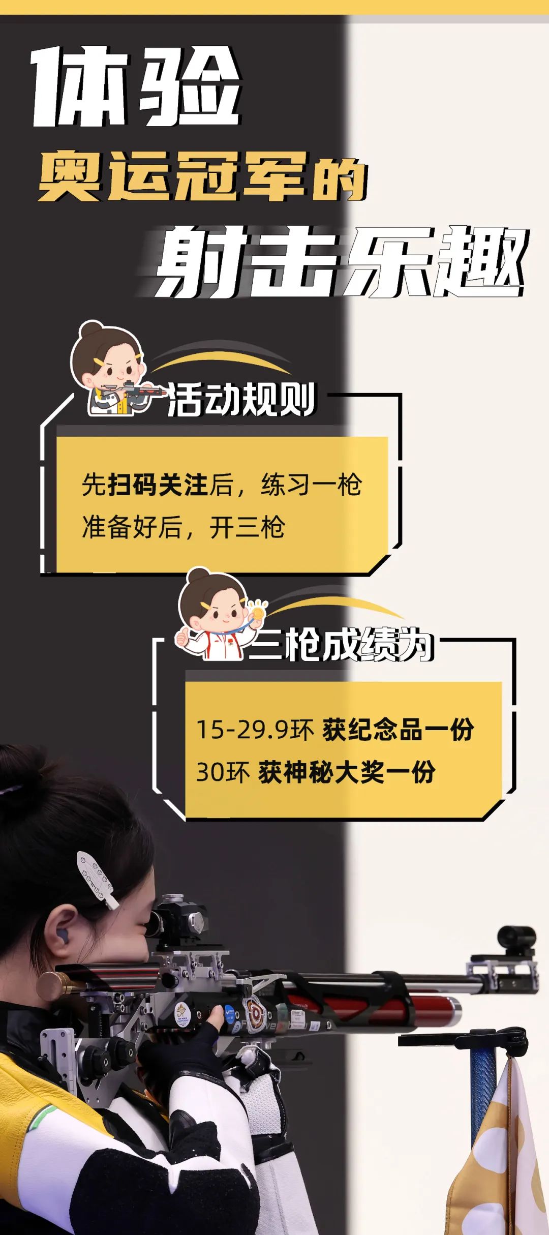 扫码关注后参与射击挑战,环数越高,奖品越丰厚!纪念品和神秘大奖等你来拿。
